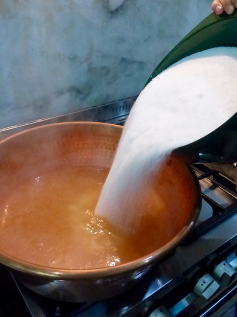 You then place that guava broth into the copper pan, turn on the heat, and reduce it by about 10-15%, to concentrate the intensity of the native guava. Add sugar (photo up top) and stir gently and some pectin mixed in with sugar as well. Stir every once in a while and bring to a boil, making sure you have a candy thermometer to keep track of the temperature of the mixture. Skim the scum off the surface. The color with turn a deep amber and the bubbles get much larger as it nears the ideal temperature around 220F. Do a freezer test on the jelly if you want to be sure.