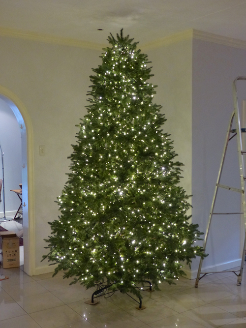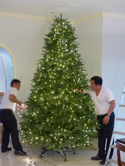 …then the critical task of putting in some 2,300 points of LED light to make the tree “glow from within”. This is the most important stage of tree decorating, and a stage that many folks take for granted. Our crew, who have been with us 20+ years, hold MCTL’s or what I like to call “Masters of Christmas Tree Lighting” degrees. Trust me, you will have great difficulty trying to pirate them. They are so good about it, even their Christmas trees at home have that “inner glow”, I know, because they proudly show me the pics every year. :)