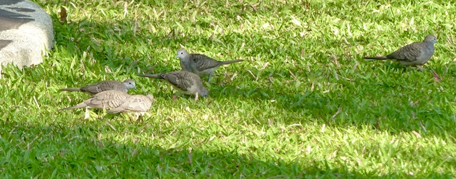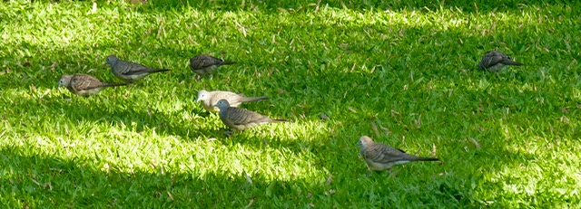 We took our “Holy Week” holiday a few days early, heading to the beach on Saturday and getting back yesterday, just as the hoards of city dwellers were starting their own pilgrimages to the beaches. So we are back in Manila for the next few days and it is blissfully calm and quiet. I woke this morning at 6:30am, looked out at the back yard, and was surprised to see a flock of some 14-18 grey doves or are they pigeons (the same family I gather) foraging for worms or other edibles. They combed the lawn efficiently, covering lots of ground and seemingly making a point of avoiding previously scoured areas. It was an unusual sight. Perhaps only once or twice a year do I ever see doves or pigeons in our yard, and this was a pretty well-timed visit, if you ask me.