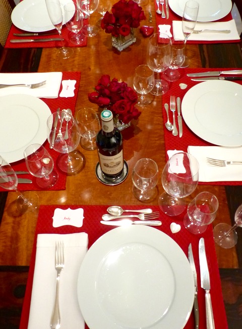 Regulars on the blog know the drill…Marketman is not fond of the Valentine’s hype. It’s a totally modern commercial “Hallmark Card” type of holiday. And the outrageous price gouging that takes place with respect to gifts, flowers and meals is ridiculous. So for many years, decades, even, we have boycotted the holiday in a sense, often opting for a good dinner in the comfort of our home, often with two, four, eight or more other friends who all seem to be first amused, then convinced by our Anti-Valentine’s Valentine’s stance… :) We’ve missed a couple of years, but everything came together this year and friends practically willed us to collectively put a dinner together. It was so incredibly easy, really. We arrived back home from a trip late on the 13th, and the crew had already done an early morning raid to the flower market, with strict instructions not to pay too much of a premium for roses, and we got several bunches at roughly PHP200 for two dozen. They weren’t the finest roses, but their acquisition meant we would go full head-on Valentine’s kitsch for the dinner. Out came the red placemats, the red roses in vases, place cards in red, and little mother of pearl hearts at each place setting…