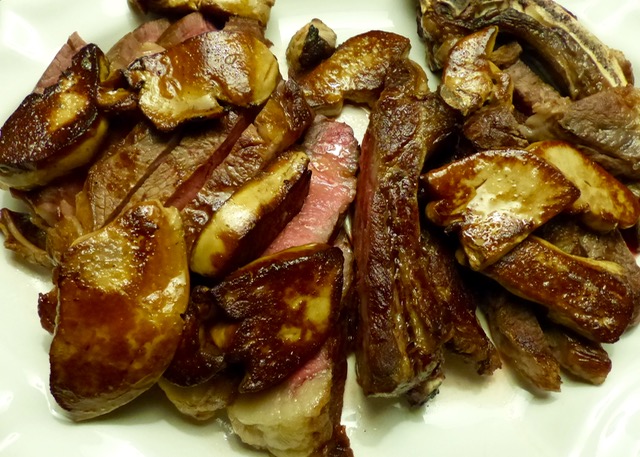 But we didn’t. Two other guests insisted on sending the meat for the evening, so we had nearly 5 kilos of the finest cowboy steaks in super thick and medium thick cuts that were cooked to order as folks specfied their preferences for doneness from medium rare to medium well. In France, they basically like their steak “blue” or rarer than rare. I prefer it rare. :) Since folks were so generous with the meat, and we had only added the tuna so far, we went whole hog and got a whole lobe of foie gras, and seared that to be served on top of the steaks, as if we didn’t have enough protein and richness yet. It was, frankly, a bit over the top.