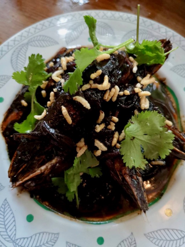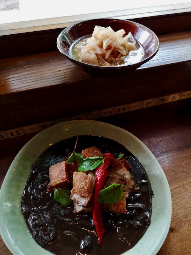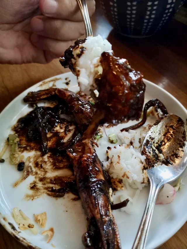 The third dish to arrive were these nearly coal black adobong sugpo. Made with squid ink (wrong guess, my bad) pureed black garlic and bay leaves (some ingredients left out), it was swoon-worthy. Again, this single dish on its own with rice would have made a meal. But I like how Chef Tom doesn’t plate up to western expectations, but rather suggests family style servings with multiple dishes to enjoy a myriad of flavors and textures. This was a dense coating of squid ink, not the watery adobos you might be more familiar with from back home. The crisped rice lightened up the look of the dish, but as Isabel put it, they look a bit like fried maggots and to some, might not be so appealing. :)