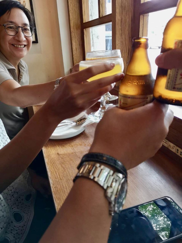 …Chief of Stuff and I had two bottles of San Miguel Pale Pilsen for a direct taste of home (I think these were brewed and imported from Hong Kong, however) and a cheery toast for all to celebrate graduation, moving into a new apartment rental, no more tuition checks for mom and dad, an epic trip to the Grand Canyon and Sedona area, touring a first-time visitor to the U.S., etc. was in order. Now to the food…