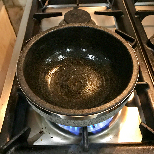 What triggered the experiment was coming across these stone bowls at a kitchen supply store while I was shopping for some other stuff. At PHP340 or so ($7) they seemed like a reasonable buy, and I got two of them. Back at home, they were washed thoroughly, placed in a cold oven and the oven turned on and placed on medium high heat where I left the bowls for say 45 minutes or so. The oven was turned off, and the bowls left in there overnight. I am not sure if this “curing” or “seasoning” step in necessary, but I did it anyway. The next day, I coated the inside of the bowl with sesame oil, put it directly on a gas flame and heated it up for several minutes until hot.