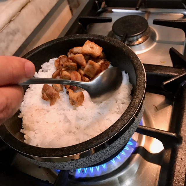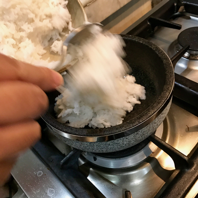 Into the hot stone bowl went rice (say 1.5 cups worth) and it sizzled just a tad, so I realized I had to keep heating the bowl further.