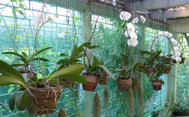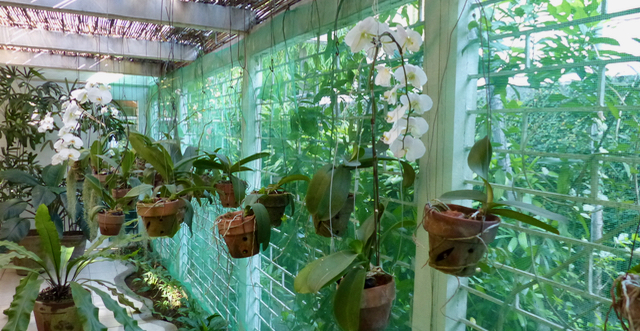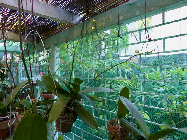 As for the orchids, the eight spikes of blooms are probably the most expensive flowers I have ever enjoyed. Two years of daily watering, occasional fertilizing, occasional lectures on plant safe sex and other topics, netting to ward off predators, trips to the air-conditioned room for experiments… :)