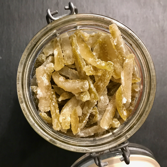 Dry the rinds on a cookie rack. The results? Very, very good. I hint of bitterness with the sweet of the sugar syrup. These will be perfect dipped in dark chocolate. And we put this little glass container out the same evening after a dinner at home with friends, and they managed to eat about 1/4th of it just nibbling along with their teas and coffees.