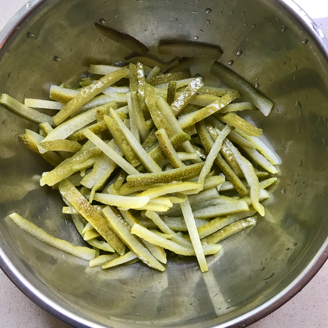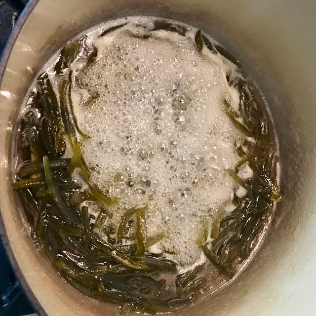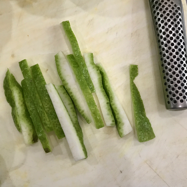 In a heavy enameled pot, add 3 cups of sugar and 3 cups of water and simmer the boiled rinds for some 2 hours or so, taking care not to caramelize the syrup with too much heat.