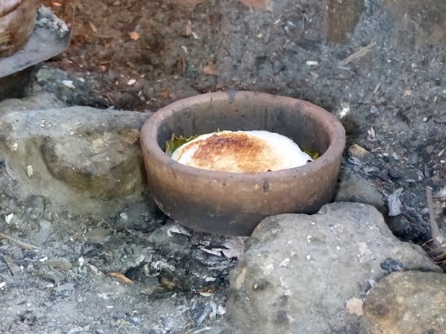Cooked in the simplest of terra cotta containers (it look like the underdish of a plant pot) over coconut husk embers and topped with a thin piece of galvanized steel with coconut embers atop it, the makeshift ovens made bibingka one at a time, and depending on the heat, to mixed results of perfectly caramelized to slightly burned.