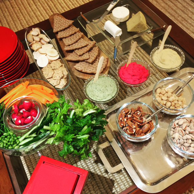 The appetizer selection was mostly vegetarian friendly with three kinds of hummus (plain, basil and beet), pistachios, pecans and macadamias, crudités and a selection of cheese that included brie, chèvre and a to die for cheddar with black truffles, all served with a selection of whole grain crackers. Pica-pica was enjoyed with several bottles of bubbly brought by guests.