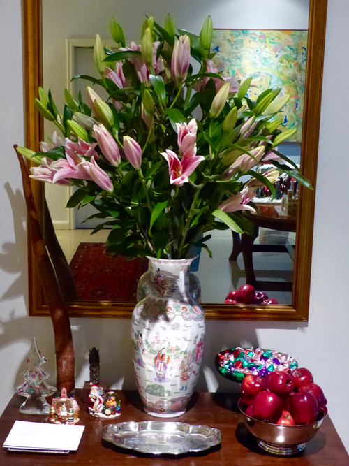 Stems of stargazer lilies simply arranged in vases joined masses of poinsettias as the floral tribute to the holidays.