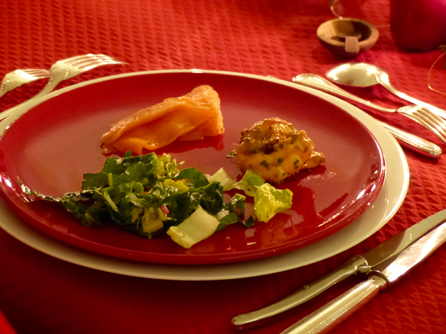 …and if you had sharp eyes you would have noticed how miserly the waiter was being with the champagne, he had to circle the table once more to add a bit more. And in the photo above, did you notice that we forgot to put salt in the salt cellars?! :) Appetizers included home-made salmon gravlax, shrimp remoulade (a HUGE success it seems) and a caesar kale salad. Set out on the buffet, guests could take whatever they liked and as much of it as they desired.