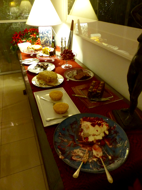 Also on offer were an apple cake, carrot and banana/muscovado/chocolate cakes, fruitcake from Sister, tortas with rum soaked golden raisins, cheesecake, brownies and a sans rival that was brought by a guest. the selection seems a bit bizarre, but with the daughter home from university, we were trying to cover several requests for favorites hence the smorgasbord approach. Also nearby was a table with cookies and sweets like homemade brittle and all kinds of chocolate.