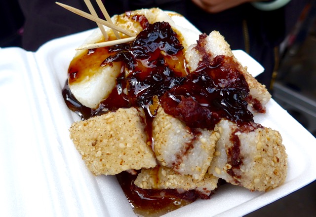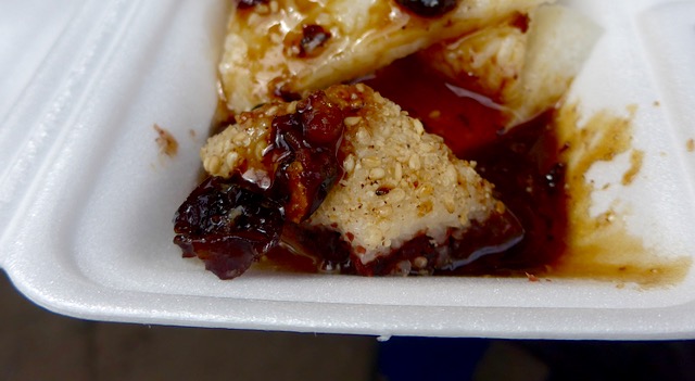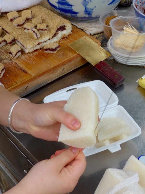 First, the vendor cuts the cold or cool rice cakes with a string. Ingenious tip, I thought. The rice doesn’t stick to the string like it would to a knife and you get clean even cuts. She puts several of these slices into a styrofoam container, then added several squares of rice cakes that have red bean paste sandwiched in between and rolled in toasted white sesame seeds (in the background of photo above).
