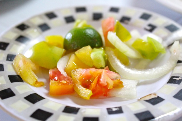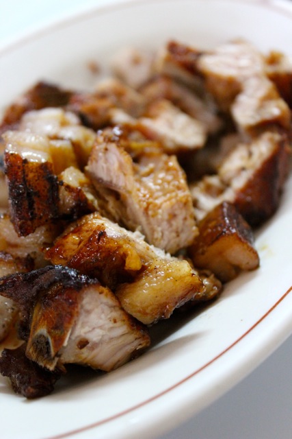 Each of us got a sawsawan (dipping sauce) plate with chopped onions, tomatoes and some kalamansi limes. There were red chilies elsewhere on the table, and some soy sauce and vinegar.