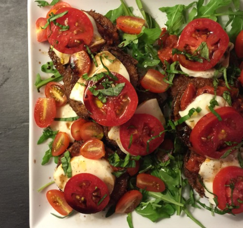 On a large platter, I put down a bed of of wild arugula, topped that with the fried eggplant slices, a quick tomato sauce made from canned san marzano tomatoes crushed and sautéed with olive oil and salt and pepper, then slices of good mozzarella, lots of ripe tomatoes sliced in different ways, lots of shredded basil and drizzled some olive oil and balsamic vinegar over everything. Oh, don’t forget some salt and pepper as well. This wasn’t really a gooey eggplant parm, more like a hot and cold salad with all the right flavor highlights. It was a HUGE HIT at dinner that evening, and something we will definitely be doing again soon.