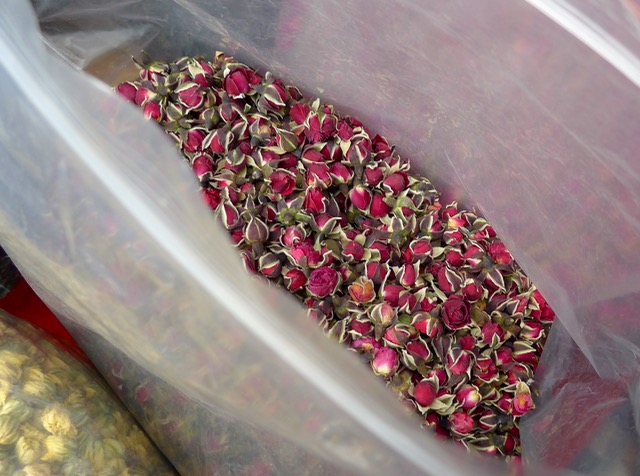 One of the first stalls we came across at the market in Xian was a vendor offering various types of green leaf tea and flowers for hot infusions. A quick question to check on the prices (ranging from 8-12RMB or roughly PHP50-75 per 100 grams) and I had to repeat the question. My jaw dropped. No bargaining, no shopping around, the price of say $11 per kilo of tea/flowers just seemed jaw-droppingly low. I bet you can get it for even lower (try $4 a kilo on Alibaba but you have to buy 5,000 kilos minimum), but I was just stunned by the prices (read:tourist). They are about $30-60 a kilo in the U.S. for rose petals for example, depending on purveyor. And at the other end of the spectrum, Mariage Freres, the tea shop I could die in, has teas at up to $4,400 a kilo!