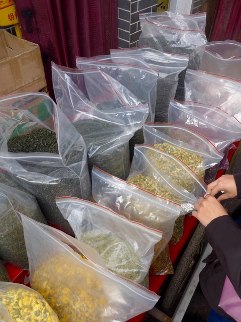 There were several quality levels of each type of flower and tea, from large blossoms, smaller ones, fresher, older. I don’t even drink floral teas, but I just couldn’t resist. So we bought 100 grams (that’s a nice little packet of tea) of chrysanthemum tea, rose tea, green teas, etc. Only spent $4-5 or so, and we had just started with the market tour! Ruixi, our guide, would later comment that of all her guests, she thinks we bought the most stuff at the market… hahaha, was I surprised? Not.