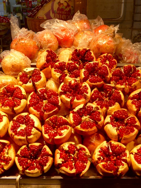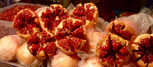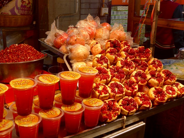 Glistening like edible rubies in the evening light, pomegranates on display in street stalls in the muslim quarter of Xian made me stop in my tracks. Regular readers of the blog have probably figured out I have a thing for pomegranates and this display was just too good to be true. I had no idea we were near the epicenter of delicious pomegranates in China, a result of trading along the silk road for hundreds of years… originally from Iran, the seeds somehow made their way to this part of China and have thrived on the fertile plains and mountainsides near Xian. While they are in season in September and October, I gather they go into a chilled warehouse and they seem to have the fruit for most of the year.