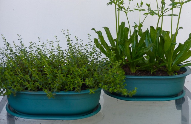 My “black thumb” is well documented on this blog. Practically everything I have planted has died. Even if I steadfastly avoid ever touching a plant and hand it straight to someone else to plant and care for, it wilts when I look or talk to it. So suffice it to say that growing our own herbs at home is an apparent exercise in futility. But I still buy the darned little pots of green every once in a while. Here several pots of thyme (though they look mysteriously like oregano) and several pots of sawtooth coriander (PHP100 for 3) seem to be thriving 5 weeks after I bought them. Could it be?