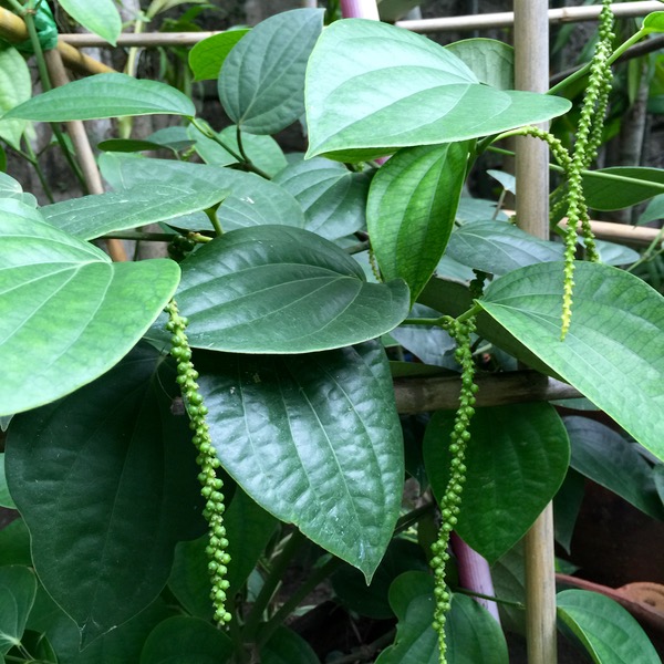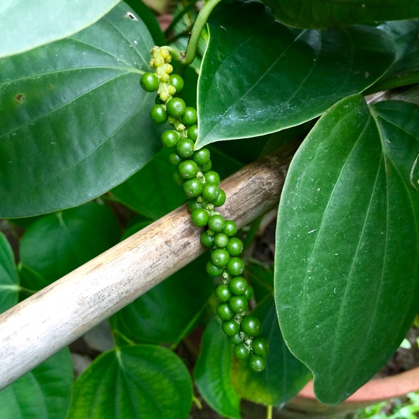 I just couldn’t believe my own eyes. Futzing around the garden the other day, I noticed a lush plant that from afar, looked like it had really healthy betel leaves. But on closer inspection the leaves were thicker, waxier and there were these strands of small green nubs. I got so excited and had to look it up, and yes, I think, for some bizarre reason, the crew have unwittingly coaxed a piper nigrum plant to grow and bloom in our backyard!!