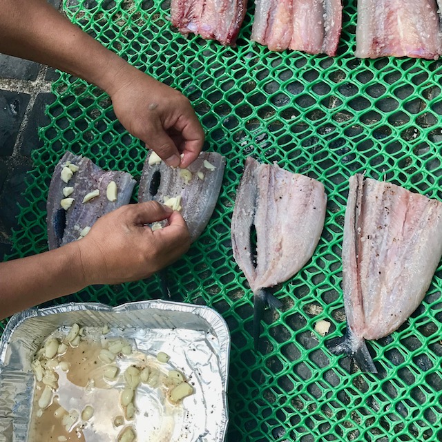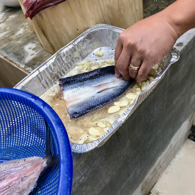 Taking off from the previous post, take the cleaned fish and dip into a marinade of coconut vinegar, salt, crushed black pepper and copious amounts of smashed garlic. I was afraid of “cooking” the fish, so only briefly washed the fish with vinegar. Some our crew looked on disapprovingly, expecting me to leave the fish in the vinegar for a while. In retrospect, I would recommend you linger while bathing the fish, more than getting wet, but not quite sitting in a bath, if you know what I mean.