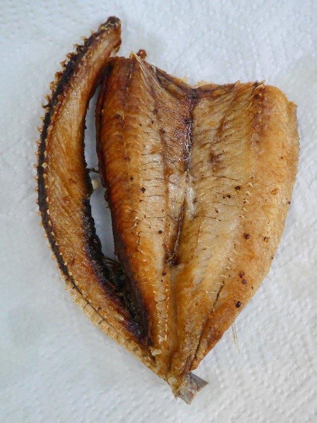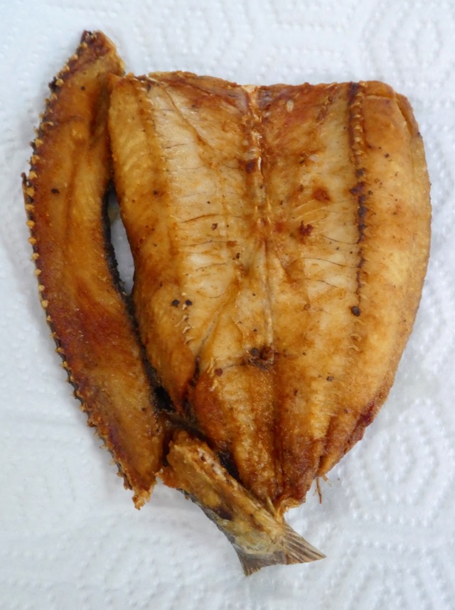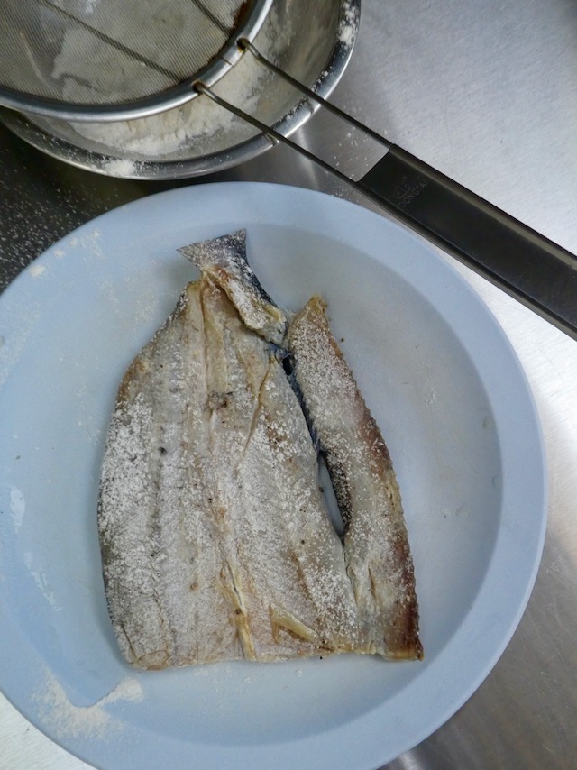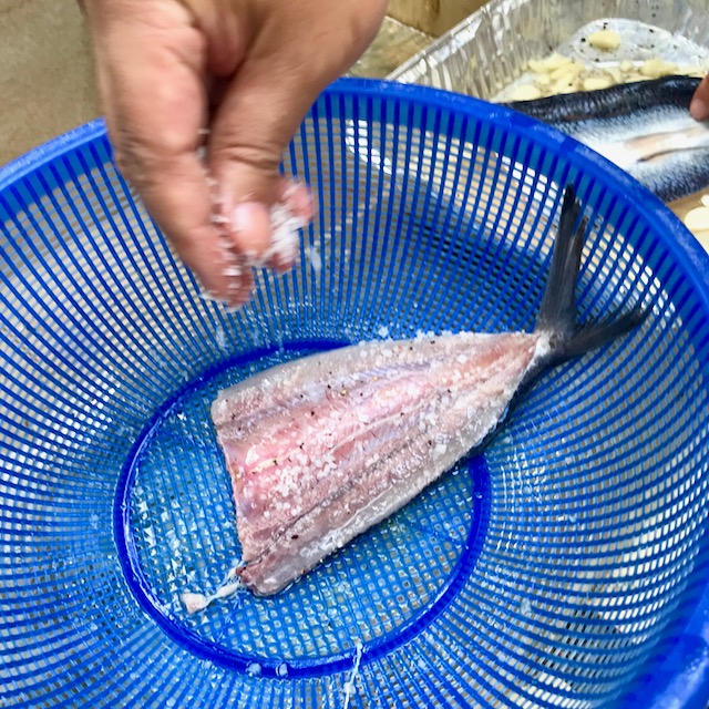 I sprinkled good local sea salt on the bathed fish. I put too much. Next time, either simply heavily salt the vinegar mixture and skip the direct salting step, or pull back on the salt, sprinkling lightly some finer natural salt instead.