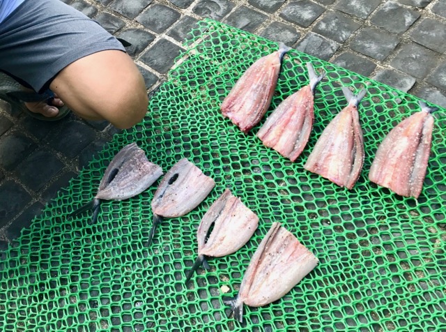 Lay out in the hot sun to semi-dry. Note that the vinegar kissed fish nearest me are already paler than the previous batch of salt cured fish. Imagine if I had left it for a few more minutes in the vinegar…