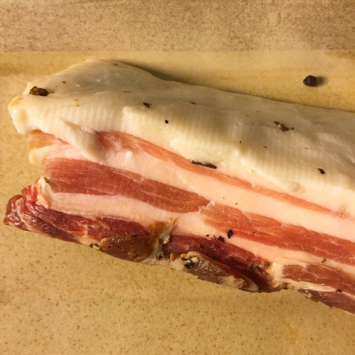 This is my recipe for homemade pancetta. It is extremely easy to do, but the ingredients, how you prep them, how long you cure them and where you cure them matters. Repeat, it matters. So please don’t make the recipe and substitute several ingredients (as many are tempted to or do) and then blame me for the odd results. It’s sort of like my Sister’s vaunted fruitcake recipe which folks always ask for, then replace specified dried fruit with things like dried pineapple and papaya then they have the nerve to bitch that it doesn’t taste the same as the original, duhhh. So you are forewarned. Once you have made a recipe or two and are confident about the results, feel free to alter ingredients to your own preferences, I do that from time to time for slight variations on the theme…
