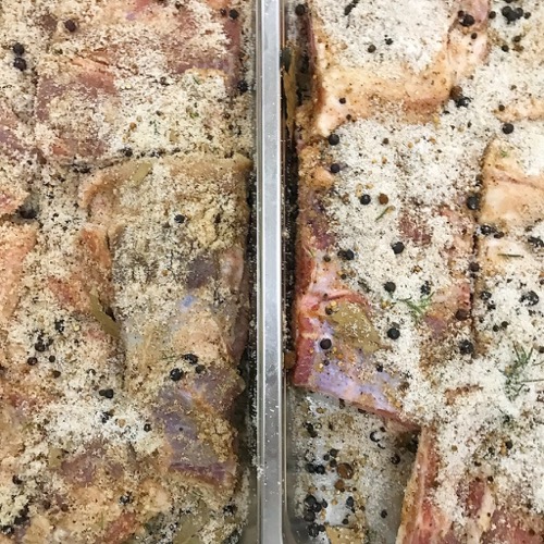 Dry your pieces of pork belly with paper towels. Then take your dry rub and coat all of the pieces well. Rubbing mixture onto all surfaces of the meat, including the sides, etc. I then place these in food pans and cover with plastic wrap and let them sit out on the kitchen counter for say 45 minutes or so to get the rub starting to dissolve. Then I place all the food pans in a fridge to marinate or cure for between 4.5-6.0 days. If the pieces of pork are quite thin, you will find that 4.5 days is enough; but if you have extra thick slabs of pork, you may need 6.0 days or so. The texture of the pork is what will give you the right cues. It should not be soft and squishy like the day you bought it; it should be firmer and harder, though not hard. Does that confuse you? :)
