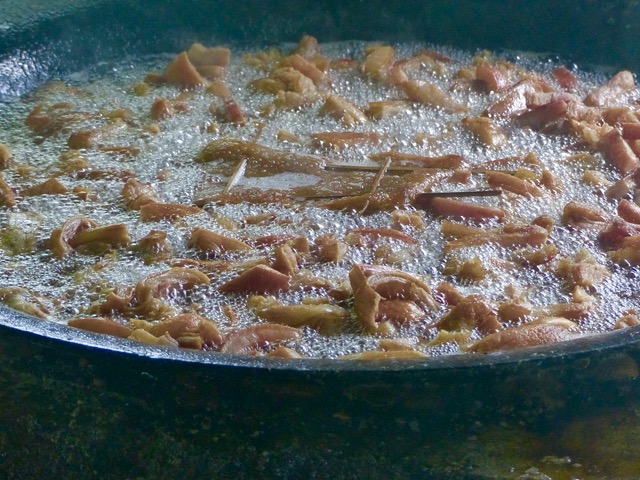In theory it seemed simple enough, take a huge piece of skin (skin only in this case, as skin and fat as we normally use for our meaty chicharon is too big and cumbersome) and boil it until tender then render it in lard and finally deep fry it in hot, hot lard. But in practice, it’s hard to prevent the skin from curling up, and thinner parts burn faster than thicker parts, edges cook faster than the center, etc.