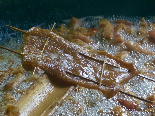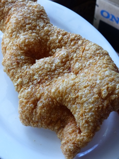 To prevent curling, Gidor inserted bamboo sticks into the skin to keep it spread out. He rendered it in lard as other typical pieces of skin/fat were being rendered. Then he removed this, heated up a vat of more lard and flash fried the rendered skin to see that final miraculous explosion into chicharon occur. He proudly brought it into the office with a smile on his face, as if his earlier skepticism was now well and truly gone. Of course we are still several versions away from the final, as we have to figure out how to produce this in bigger quantities?, how do we package it so it doesn’t soften, how much seasoning is required?, how can we make it even more ginormous? etc., etc. Then of course I want to try the long curly chicharons from Bangkok markets, tiny bit sized pieces of thinly cut chicharon, and so many others… :)