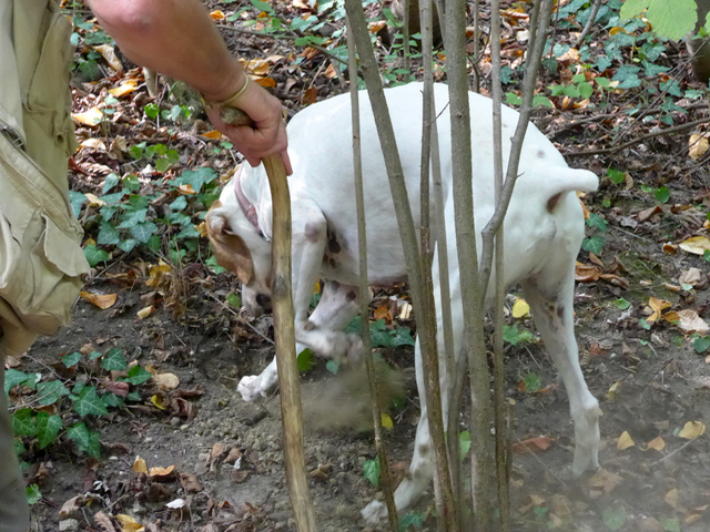 …in this case, the first find was a tiny white truffle, smaller than a marble, but Brio got a treat nonetheless. Truffles are unusual in that they ripen at a particular time, with no regard to shape or size, so they could be tiny or enormous, up to say a kilo in weight. And you could apparently hunt through a part of the forest in the morning and turn up empty-handed, but find a ginormous truffle in the late afternoon.