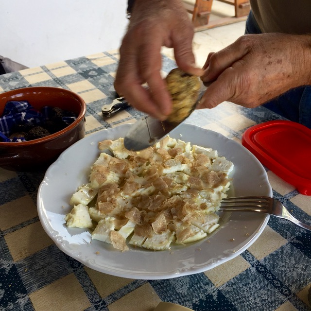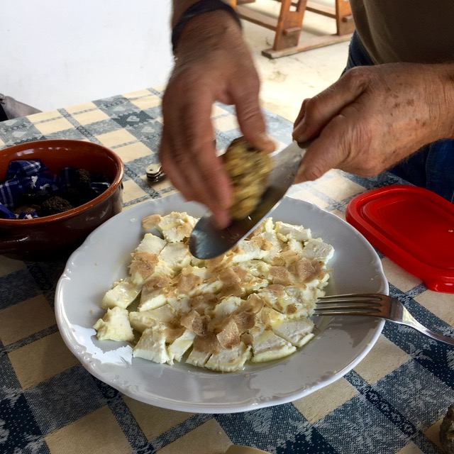Back at La Casa del Trifulau after an hour hunt in the woods, our hosts/guide laid out the spoils of the day… one medium sized black truffle and some modest sized white truffles. You don’t get to keep the truffles found on your hunt, but you could offer to buy them if you liked. At Euro3,000 per kilo, white truffles are a luxury, but dial that gasp back and realize that 5-10grams shaved over your risotto or pasta is enough to give you a heady experience, at say Euro20-30 per serving. So while it is incredibly pricey, a little goes a long way. In London, New York or Tokyo you might be charged anywhere from $100-150 for a shaving of truffles (say 5 grams), so that’s 4-5x the price at the source, but when in the heart of white truffle country, I say what better time to indulge…