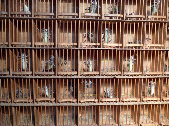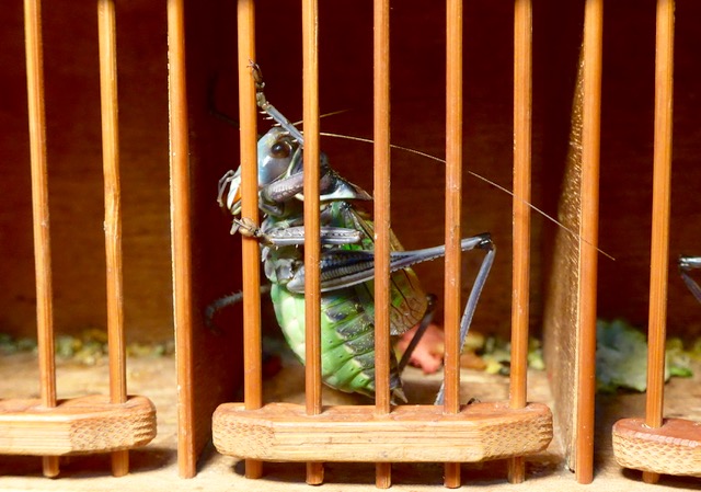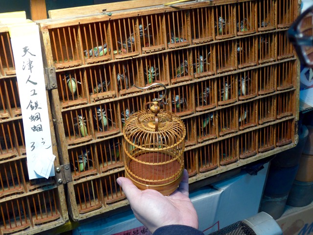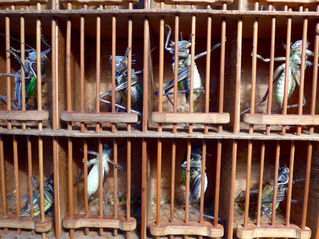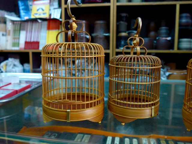 The store also sells cages, from a few dollars to nearly $100 each, and I had my eye on these fine specimens made of bamboo. I was drawn to the craftsmanship and detailing of the work. I sorely wanted to bring crickets and cages home, but realized that violated several laws that could probably land me in jail.