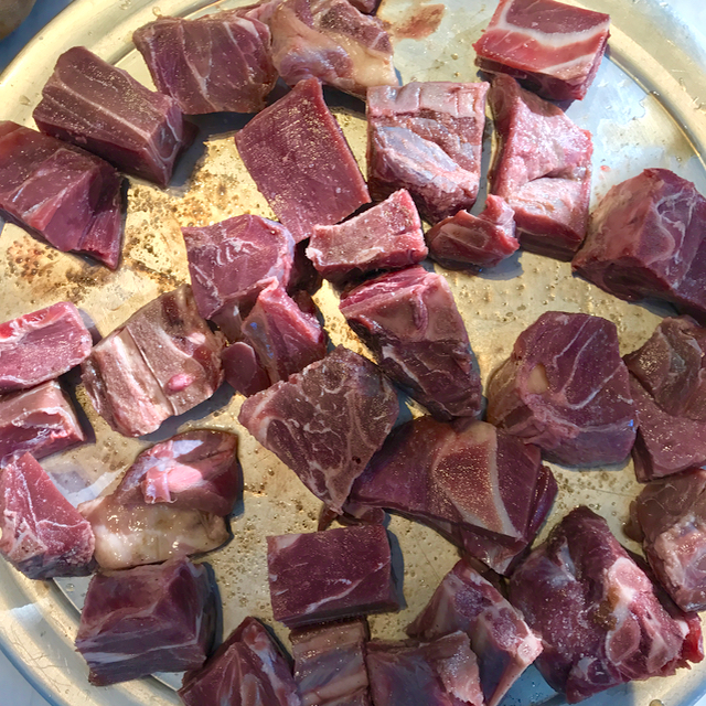 Start with good cubed goat meat. Sprinkle with red wine vinegar, salt and pepper and let this sit for 20 minutes or so.