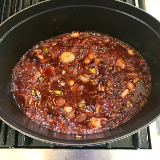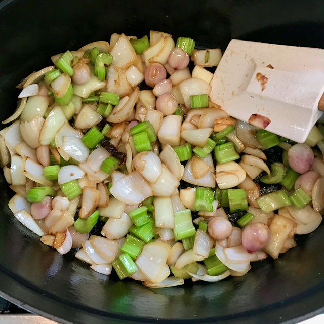 Using all the remaining fat (both olive oil and goat fat), saute lots of onions, shallots, celery and garlic on medium-high heat until they are fragrant and a bit translucent. The smell in your kitchen right about now should be wonderful.