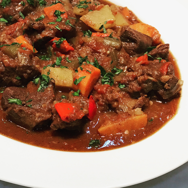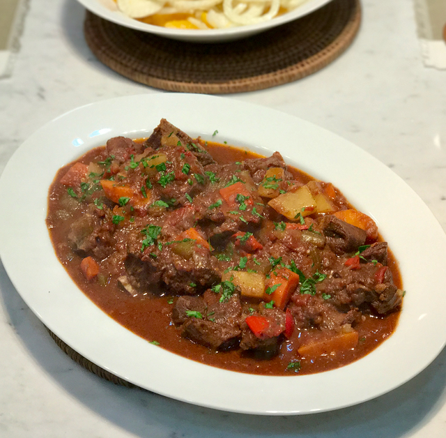 Cover the pot, and place it in a pre-heated 325-335F oven for say 2 hours or more until goat is almost fork tender. At the two-hour point, add in cubed potatoes, carrots, red bell pepper and 1-2 siling labuyo or bird’s eye chilies. Also add in some liver paste (either freshly made or canned) as a thickener. Put this back in the oven (uncovered if too watery) covered if it is about the right consistency (I like it quite stewy). Cook another half hour or so and check the potatoes and seasoning and make last adjustments.