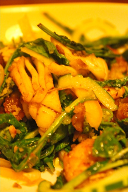 A thai squid salad, made unconventionally with young wild arugula and with the addition of bacon? seemed dischordant, but it tasted wonderful. Pork and seafood often pair well, and while this wasn’t the most authentic set of ingredients perhaps, I loved it. Nice spice incorporated into the dish as well.