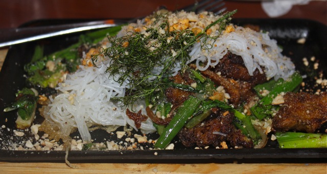 A bowl of pho, the first dish we ever tasted at the restaurant, and oddly, we didn’t quite like it. The bowl had unusually tough pieces of beef, with large yellowed fatty pieces as well. Perhaps some smoked pork found its way into the broth? The broth which lacked verve, flavor and depth — perhaps it hadn’t had enough time to concentrate the flavors? But this was a surprisingly weak offering, and I haven’t had it since. I should try it again, because I really do love a good bowl of pho.