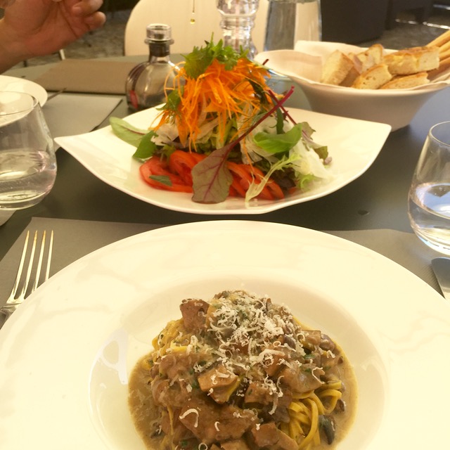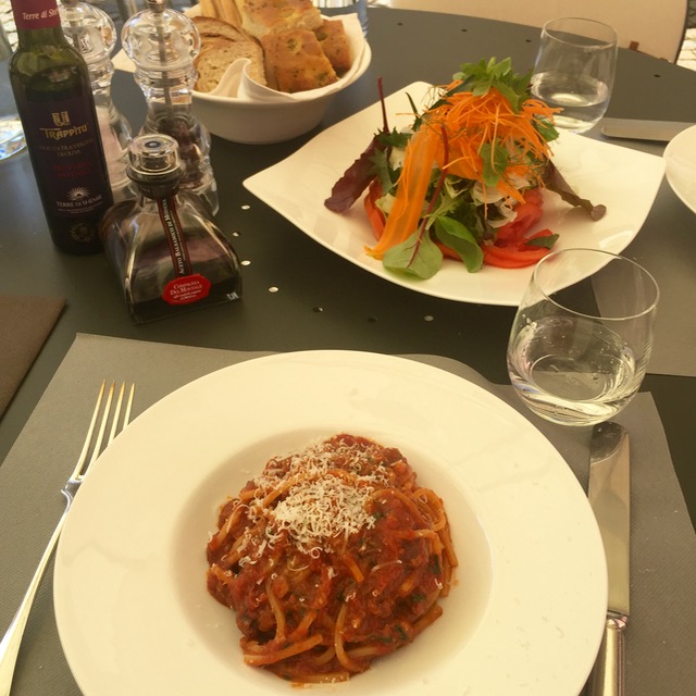 We arrived well after noon, almost 2pm I think, and after 30 hours in transit, we were tired and I was very hungry. The staff at the hotel offered to serve lunch from the Bistrot menu out in the courtyard and we settled into our table under a large umbrella and ordered a simple lunch of pasta and salad. I had the spaghetti all’Amatriciana, first because the hotel and (hundreds of other restaurants across Italy and the world) had a promotion where they donated some of the proceeds from the dish to the hill town of Amatrice that was recently devoted by an earthquake, and second, this pasta is a personal favorite. It arrived well-sauced, almost over-sauced really, but it was delicious and exactly what I needed.