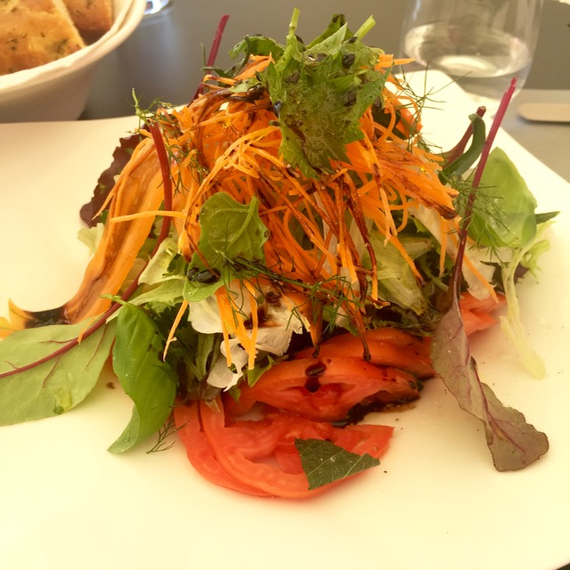 We shared a beautiful mixed green salad that was thoughtfully assembled… 4-5 kinds of incredibly fresh and properly hydrated lettuce leaves and beet tops, thinly shaved fennel, fennel fronds, basil, other herbs, finely julienned carrots and oddly, some torn shiso leaf that provided hits of flavor that I found unusual and out of place at first. But when I asked if it was indeed shiso, they nodded and I guess I learned something new that day with respect to the mixture of greens and how a basic salad can be easily elevated with care and creativity. Dressing was just a good olive oil and some excellent balsamic vinegar. A bread basket just put the carb count way over the top. But fortified, we retired to our room for a couple of hours before taking a late afternoon stroll through town to prepare ourselves for dinner at the Bistrot proper…