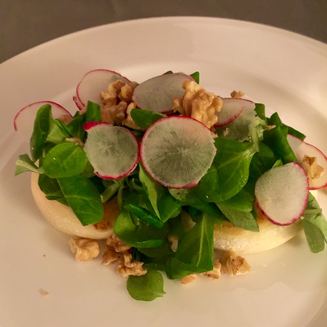 Mrs. MM wanted a light dinner, and only ordered this salad with some toma or tomino (sorry, didn’t note the exact variety) cheese with some lamb’s lettuce, radishes and walnuts. It was heavier than it looks, with two generous slices of warmed cheese lurking under the leaves.