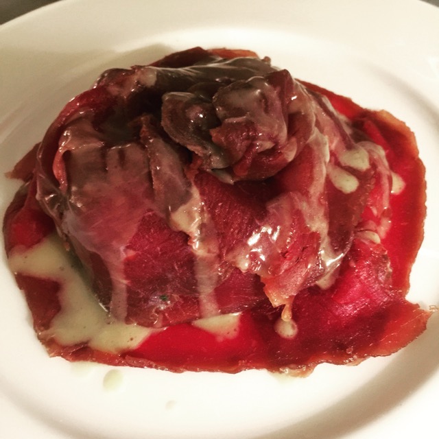 The meat must have been salted and aged for a while, it was just so intensely red, and it was beautifully arranged in a mound over lettuce leaves, a clever reversal of the more common way of laying the meat flat on the plate, and piling the greens and dressing on top of it. The hotel writes that the dressing was made with honey, lapsing souchong tea and lemon, a snazzy vinaigrette of sorts.