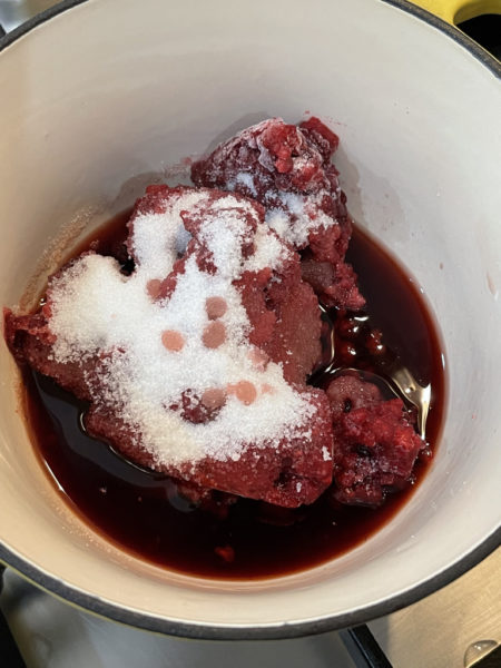 Reserve a cup of the poaching liquid and throw the rest out, spices included. In the same pan, add several cups of frozen or fresh raspberries, say half a cup of the poaching liquid and say 3/4 or more of a cup of sugar and bring to a simmer. After a few minutes simmering, blitz in a blender and pass through a fine sieve. Cool and chill, this is your raspberry sauce. Taste this sauce, sometimes I forget and its sometime too tart, a nice balance of sour and sweet is always good.