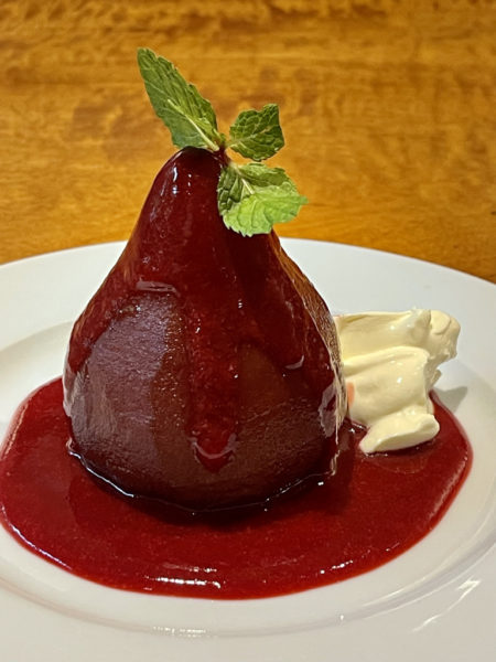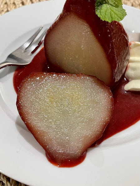 Fifteen years ago, in 2006, I posted this recipe of a personal favorite dessert, poached pears with raspberry sauce. This is an elegant, festive, relative easy dessert and always seems to be a crowd favorite. While I make an extra effort to have it at least once during the Christmas holidays, in Manila, it’s really dependent on when the import gods manage to bring in good Bosc pears. Yes, the pear variety matters. If you really can’t find Bosc pears, you could substitute just ripe Anjou pears as a second choice.