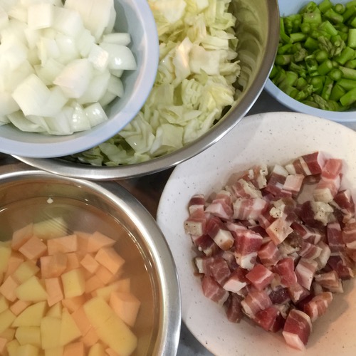 I have written about vegetable soup before, but without firm recipes, as mine changes with whatever is in the fridge or I find in the market. But here are some of my tips and tricks for a really hearty and tasty vegetable soup. First, start with a wide variety of ingredients, the more the merrier, almost. Don’t throw everything in your fridge into the mix, there has to be a bit of method to the madness. I usually have onions, carrots and celery. I add some cubed potatoes and sweet potatoes when I have them. Green beans or overgrown haricots vert are another staple, as is cauliflower, occasionally broccoli, mushrooms, cabbage, kale, etc. Kalabasa or kabocha squash, zucchini (green or yellow), tomatoes, red bell peppers, etc. all work as well.