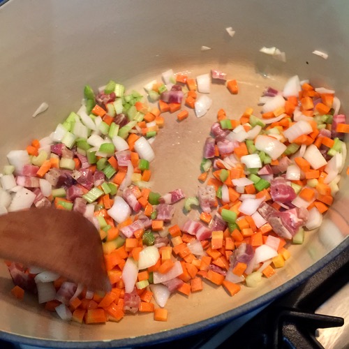 Start with your fat (olive oil for me) and the pancetta, carrots, onions and celery. Let this saute for a good 10 minutes until they are well cooked, and a bit of brown stuff shows up at the bottom of the pot. I use a heavy enameled cast iron pot to make my soup in.