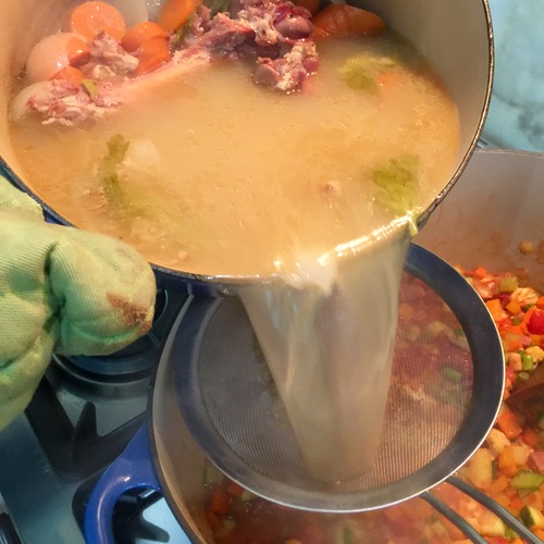 Next I add a freshly made broth with ham bones, onions, celery and carrots that is another key step for building flavor. I always buy the ham bones from grocery ham vendors and stock them in our freezer so I can make a ham broth whenever we need it. The bones are the cheapest natural way to build depth of flavor, and it beats canned chicken or other broths by a mile. If you don’t want a pork-based broth, then a good chicken stock is a great alternative.