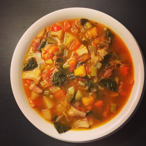 most of the leftovers in my fridge find their way into omelets or soups like this – 2 pieces of bacon, half a porkchop, etc. i like adding italian seasoning or a combination of herbs, even curry seasoning (then it becomes mulligatawny, sort of). sometimes i add a cup or so of Red Mill Vegetable Soup Mix – it has assorted beans and grains and my favorite, alphabet pasta.